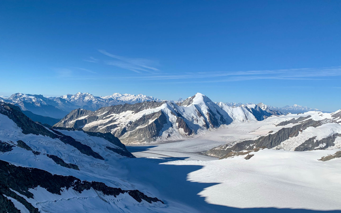 While climbing up from Ewigschneefeld to the Fieschersattel. Beatiful view to the other summits: Monte Leone, Lagginhorn, Mischabel-Group, Matterhorn, Aletschhorn and Mont Blanc in the back (from left to right)